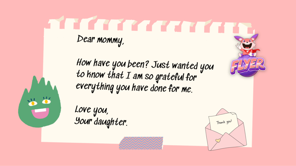 | Dear Mommy, How have you been? Just wanted you to know that I am so grateful for everything you have done for me. Love you, Your daughter. | Mẹ kính yêu, Mẹ có khỏe không? Con chỉ muốn nói rằng con rất biết ơn vì những gì mẹ làm cho con. Yêu mẹ, Con gái. |
