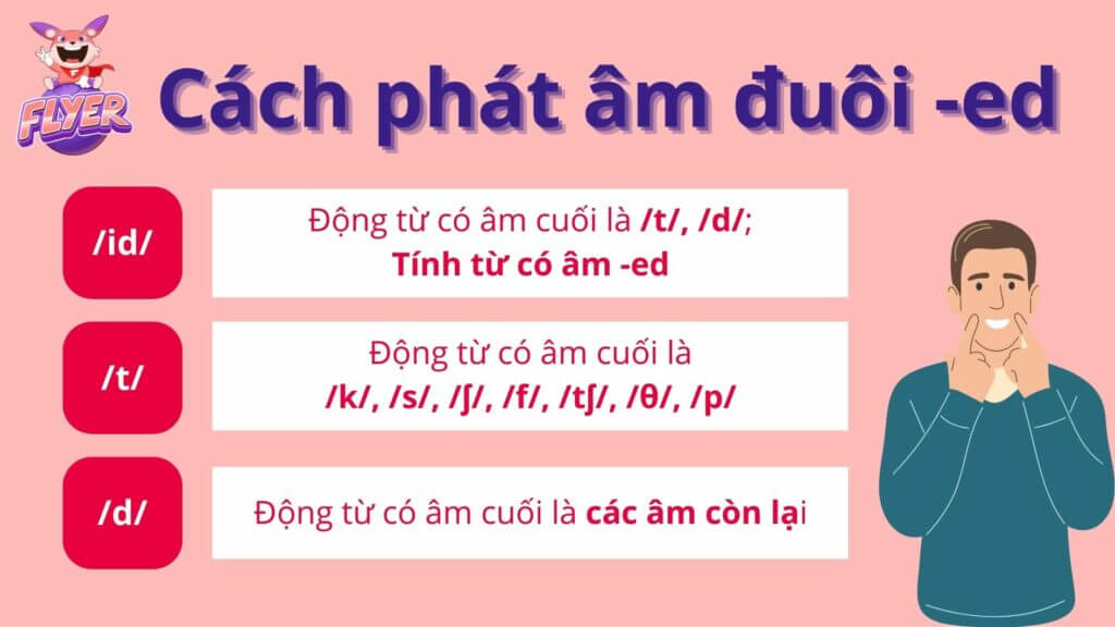 Để đọc âm -ed đúng chuẩn, bạn cần dựa vào âm tiết cuối (âm đuôi) của động từ nguyên thể và áp dụng một trong ba quy tắc phát âm -ed trong bài viết dưới đây. Cùng FLYER tìm hiểu nhé!