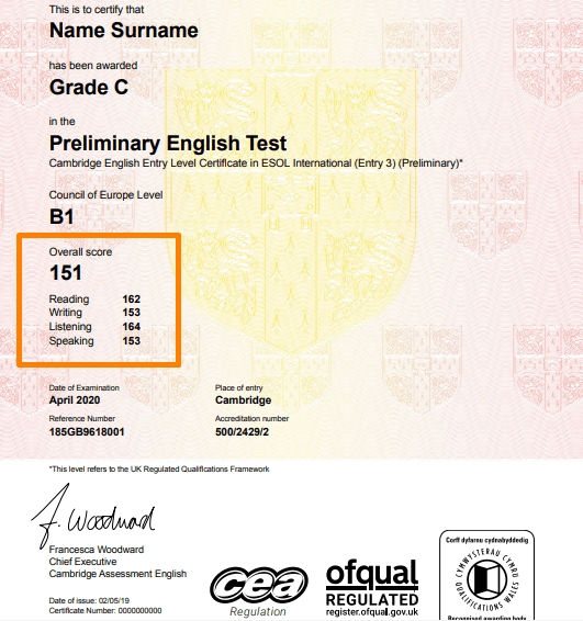 Thí sinh sẽ nhận chứng chỉ và Phiếu điểm (Statement of Results) nếu đạt từ 140 điểm trở lên (điểm tối thiểu của trình độ B1). Nếu chỉ đạt 102-119 điểm, thí sinh chưa đủ trình độ B1 và chỉ được nhận Phiếu điểm. Trên Chứng chỉ hay Phiếu điểm không ghi kết quả đỗ/trượt, chỉ thông báo điểm thi và trình độ tương ứng thí sinh được công nhận với mức điểm thi của mình.