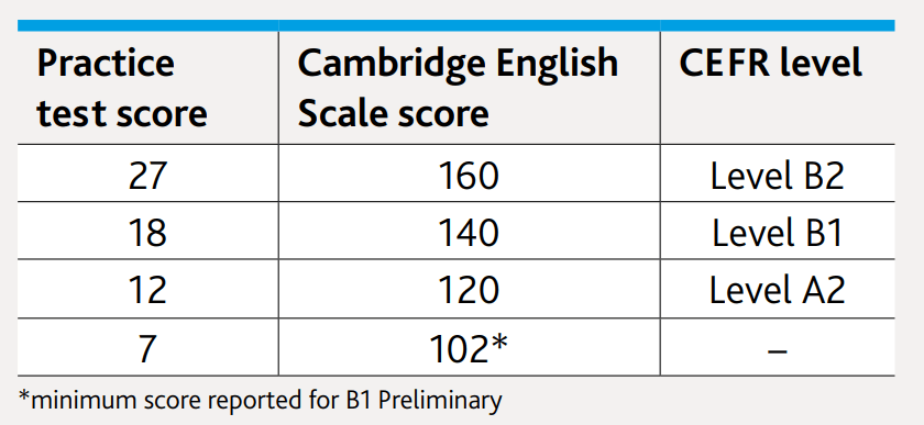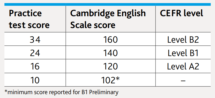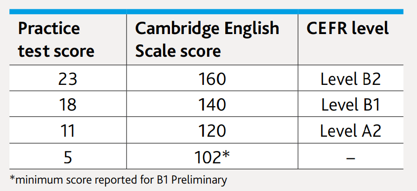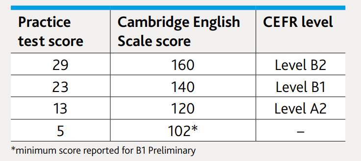 Cambridge không cung cấp bảng quy đổi chi tiết với từng mức điểm (0-32 điểm), song có gợi ý khoảng điểm quy đổi và cấp độ CEFR tương ứng với một số khoảng điểm Practice test score như sau: