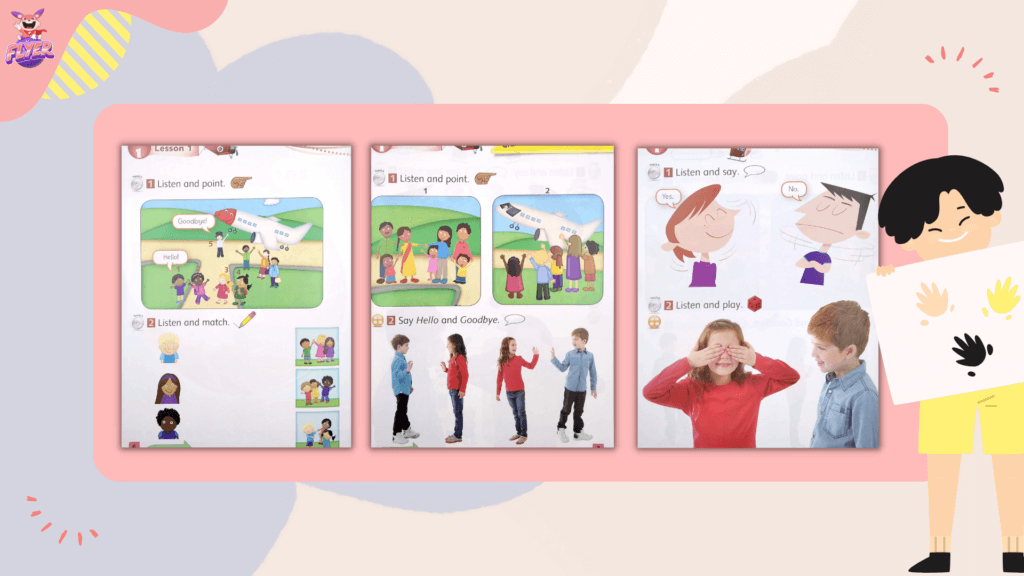 | Bài 3 và 5. Âm và chữ cái (Lesson 3, Lesson 5: Sounds and letters) | Bài học về âm và chữ cái sẽ bao gồm Tranh khởi động (minh họa chữ cái đầu tiên của mỗi từ) và Các âm vần, chữ cái và cách thức đánh vần ngay trên tranh khởi động. |