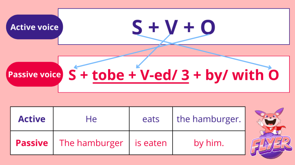 | Câu bị động | The hamburger Chiếc ham-bơ-gơ | is eaten được ăn | by him. bởi anh ấy. |