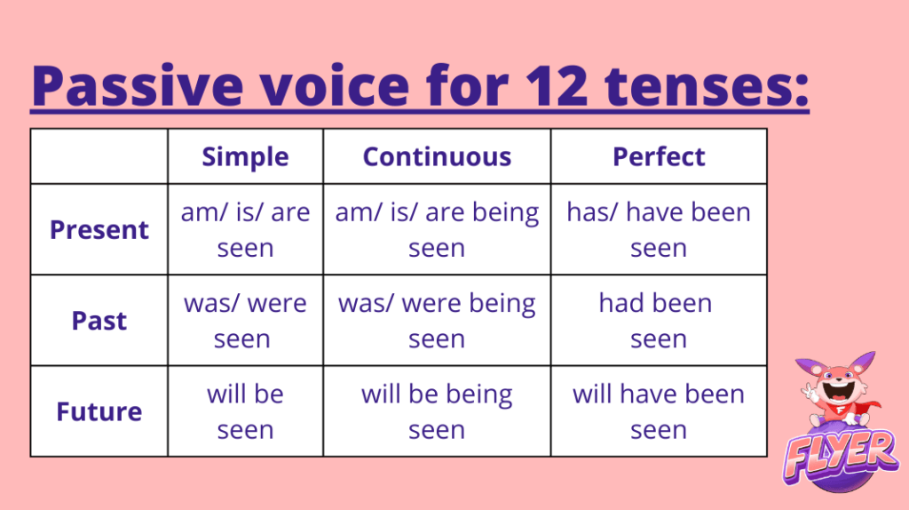Để làm rõ hơn cho bạn cấu trúc câu bị động, dưới đây là ví dụ động từ “see” ở các dạng động từ và 12 thì tiếng Anh khi chuyển sang thể bị động.