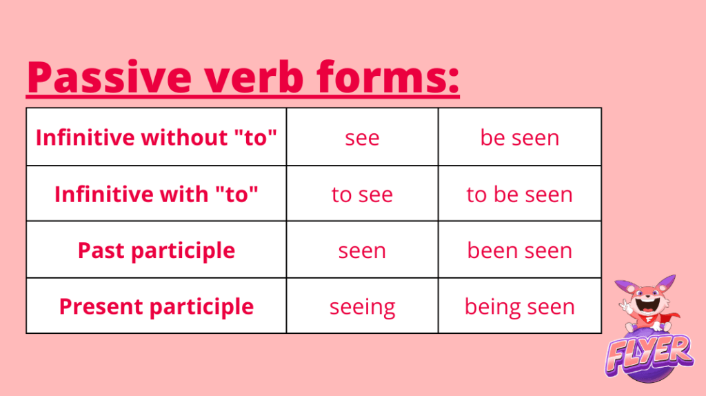 | Động từ nguyên thể có “to” | to see | to be seen |