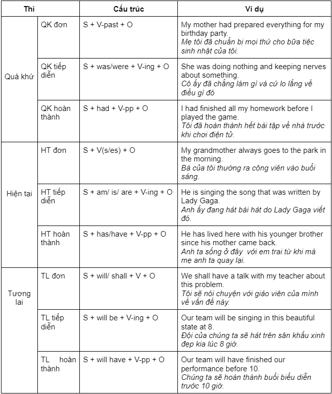 Để các bạn có cái nhìn toàn diện hơn, thì sau đây là bảng câu khẳng định ở các thì cơ bản trong tiếng Anh.