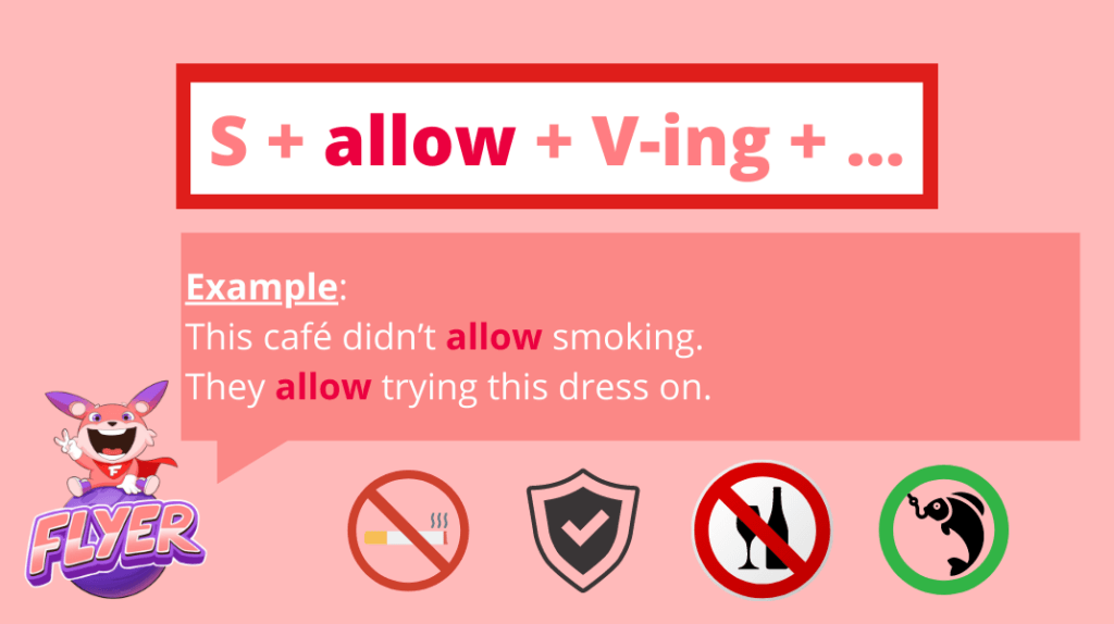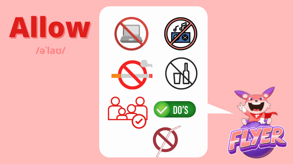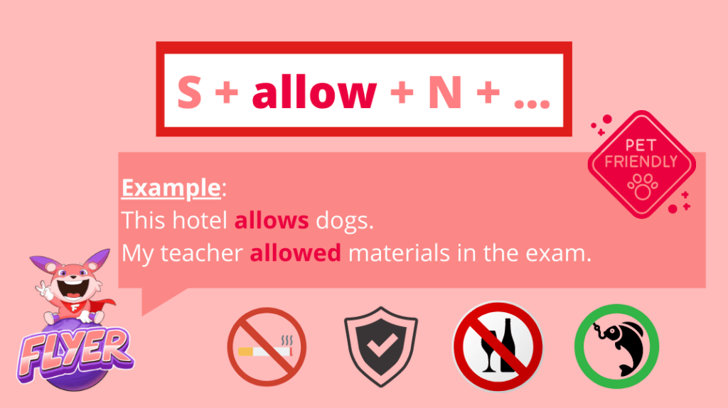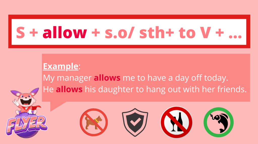 Cấu trúc “Allow” dùng để nói về sự cho phép, chấp nhận của một người để một sự việc nào đó diễn ra. Trong bài viết này, FLYER không những đề cập đến khái niệm và cấu trúc chi tiết của “Allow” mà còn phân tích điểm khác biệt của “Allow” với các cấu trúc gần giống nghĩa. Cùng FLYER tìm hiểu ngay nhé!