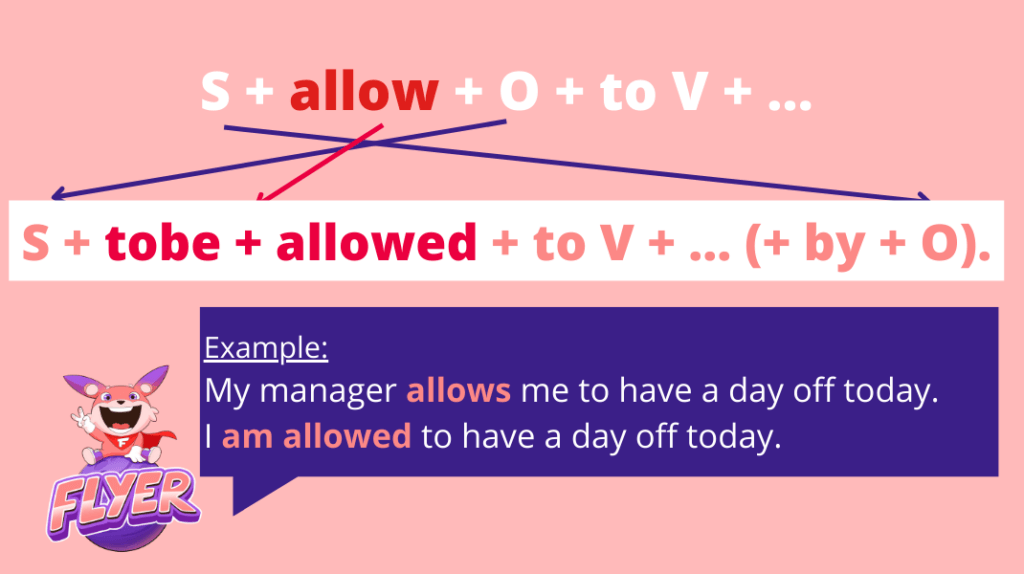 | S [O] + tobe + allowed + to V + … (+ by + O [S]). |