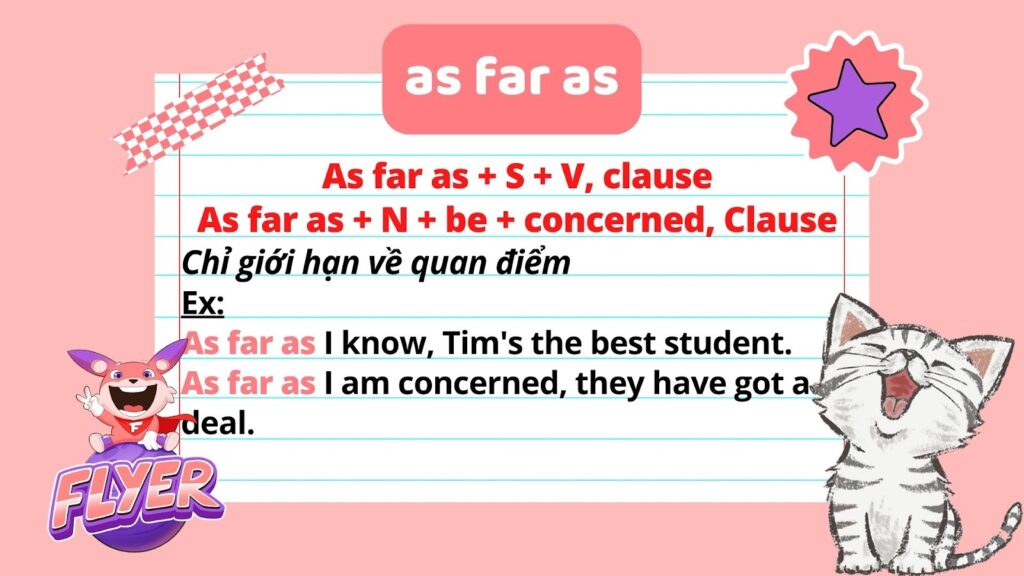 “As far as” nghĩa là “xa tận”, “đến tận”, “đến mức mà”. “As far as” nếu được đặt ở đầu câu sẽ mang nghĩa là “theo như”, dùng để đưa ra ý kiến và quan điểm của người nói về sự hạn chế của một việc nào đó được thực hiện hoặc độ can thiệp của ai đó đối với một vấn đề.