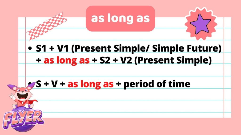 S1 + V1 (Present Simple/ Simple Future) + as long as + S2 + V2 (Present Simple)