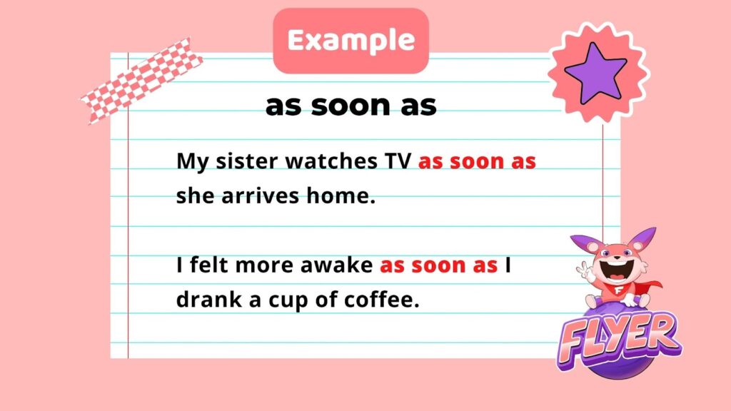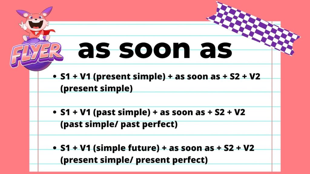 - Cụm từ “as soon as” có thể đứng ở giữa câu hoặc đầu câu.