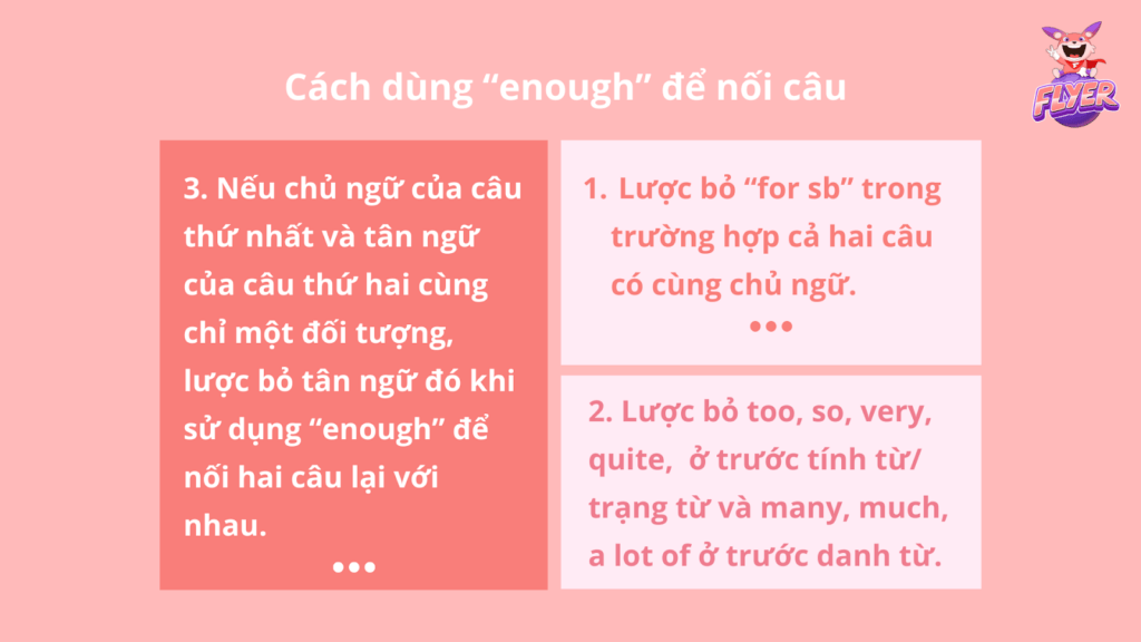 Khi sử dụng “enough” để nối câu, bạn có thể lược bỏ thành phần “for sb” trong trường hợp cả hai câu có cùng chủ ngữ.