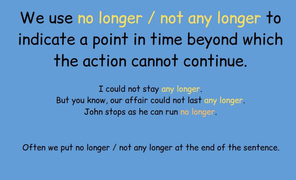 Lưu ý: Trong câu phủ định ta không dùng “no longer”, thay vì vậy chúng ta sẽ dùng “any longer” hoặc “any more”: