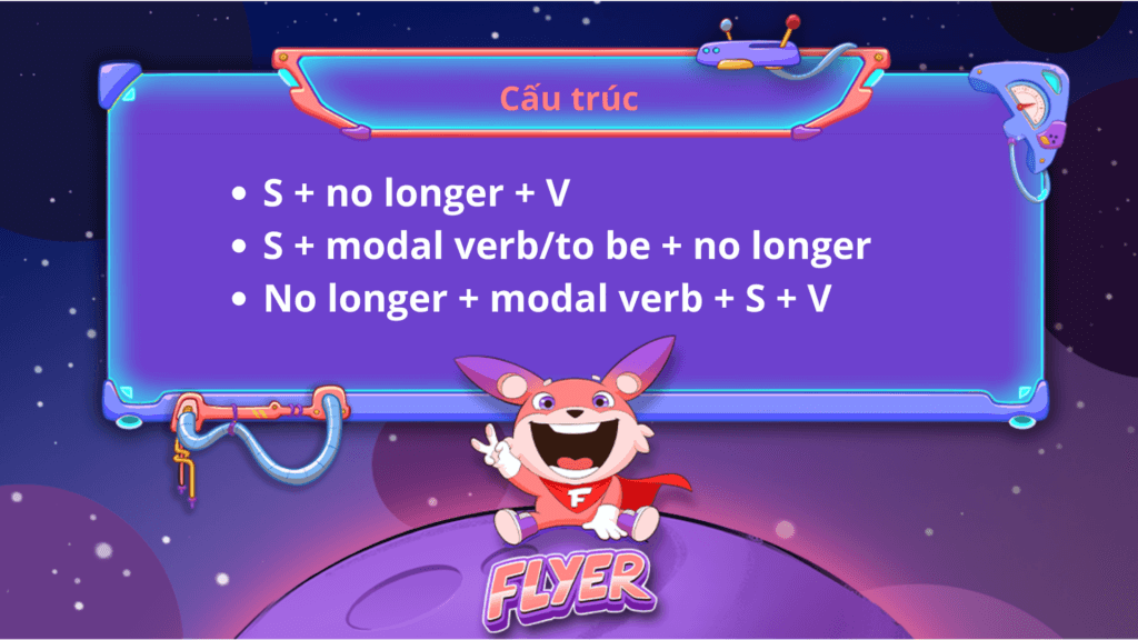 Chủ ngữ + động từ khiếm khuyết + no longer (Subject + modal verb + no longer)