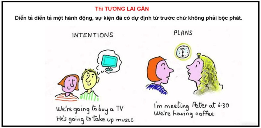 Có sự lên kế hoạch để thực hiện, tuy nhiên khả năng xảy ra thấp hơn thì HTTD. Thời gian có thể không được xác định. Dấu hiệu nhận biết: Có thể có hoặc không đi kèm các trạng từ chỉ thời gian. Không đi kèm với động từ “go” và “come” Ví dụ: