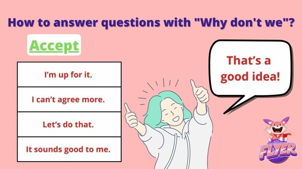 Để trả lời cấu trúc “Why don’t we” một cách lịch sự, dù là đồng ý hay từ chối, bạn có thể tham khảo một số mẫu câu dưới đây: