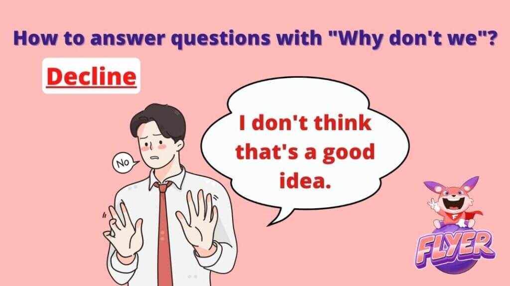 Ngược lại, nếu muốn từ chối lời đề nghị “Why don’t we”, bạn không nên dùng “No” bởi cách trả lời này quá thẳng thừng và có thể khiến người nghe không được tôn trọng. Thay vào đó, bạn có thể tham khảo một số cách sau: