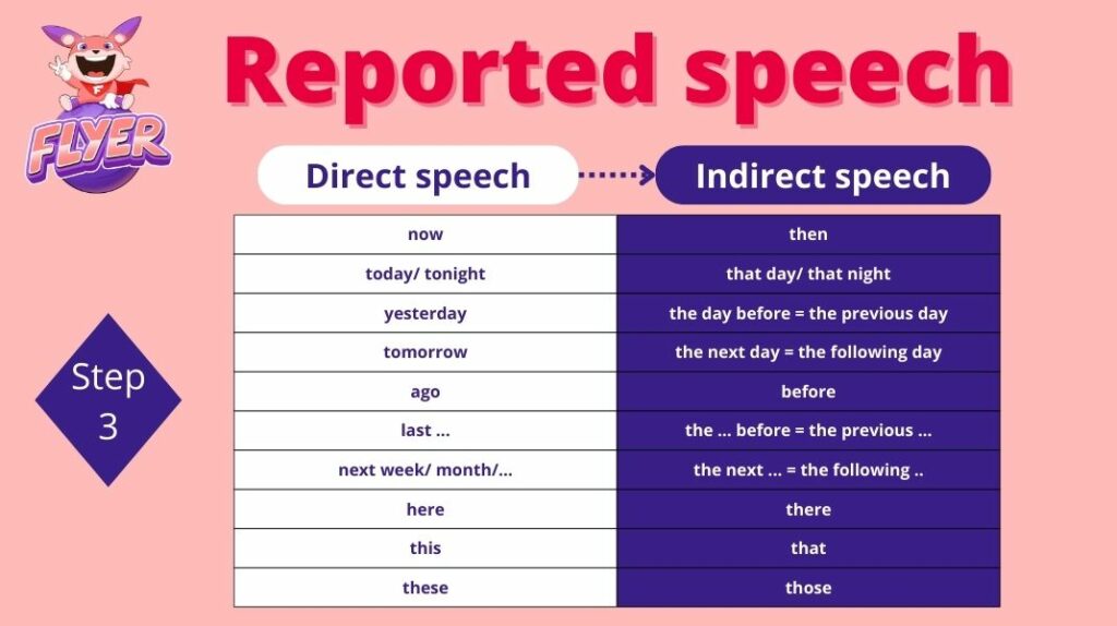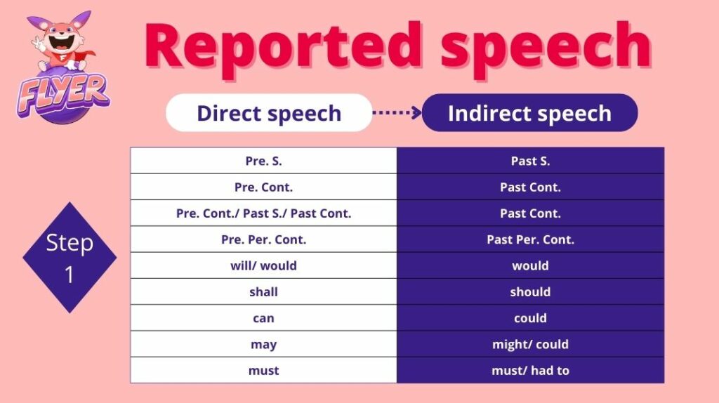 - Có 4 bước chuyển đổi từ câu trực tiếp sang câu gián tiếp:
