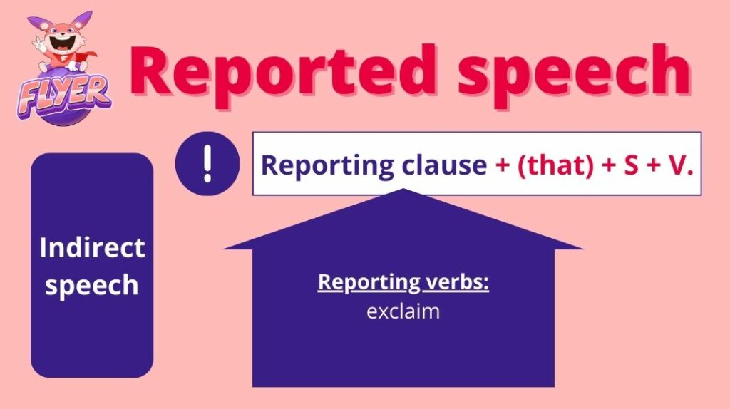 Động từ tường thuật thường được sử dụng trong câu cảm thán gián tiếp là “exclaim” – “thốt lên”. Theo đó, bạn có cấu trúc câu cảm thán gián tiếp như sau: