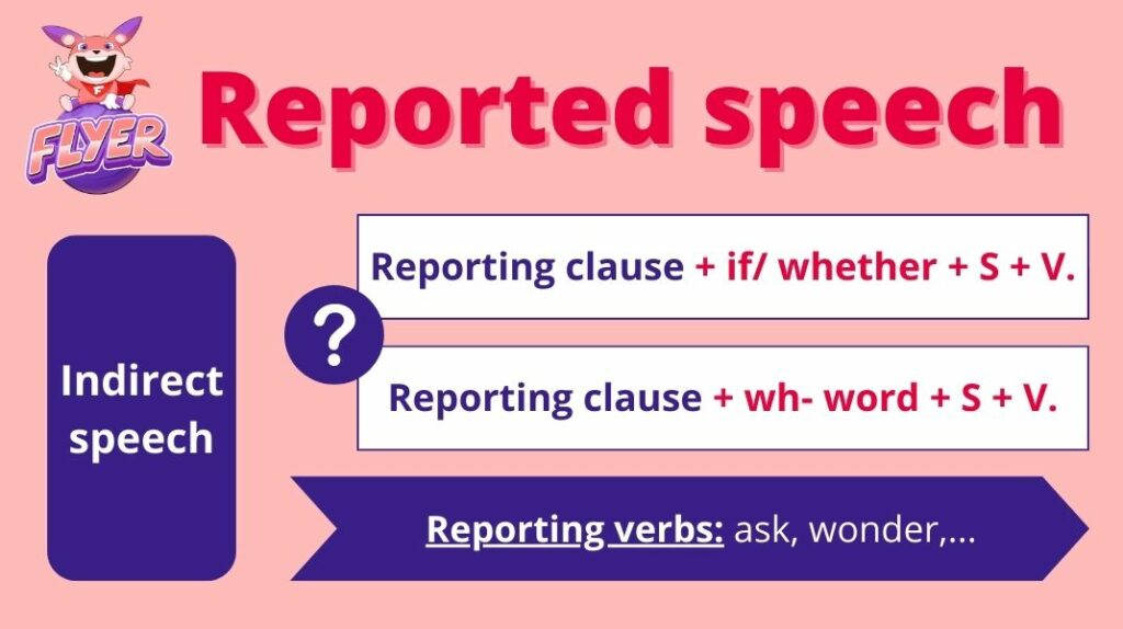 Có hai loại câu nghi vấn là câu hỏi “Yes/ No” và câu hỏi “Wh-”. Với mỗi loại câu hỏi, bạn có những cấu trúc câu gián tiếp riêng biệt như sau: