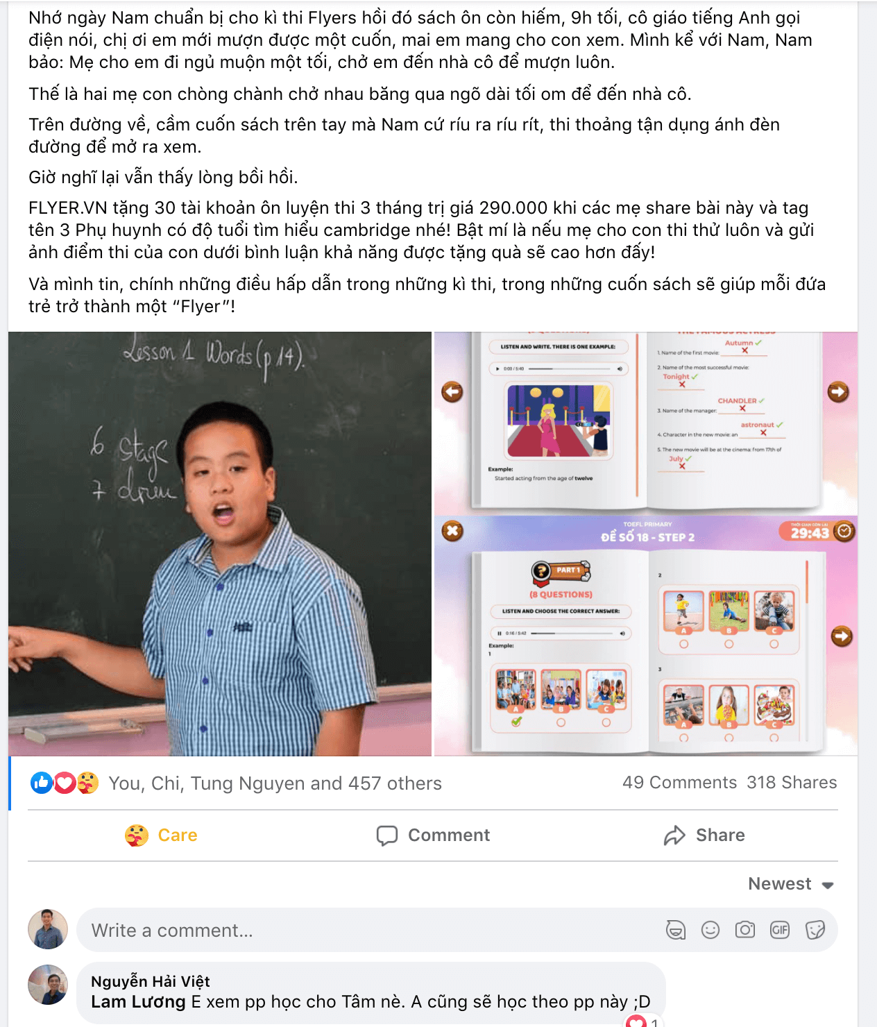 Nhớ ngày Nam chuẩn bị cho kì thi Flyer hồi đó sách ôn còn hiếm, 9h tối, cô giáo tiếng Anh gọi điện nói, chị ơi em mới mượn được một cuốn, mai em mang cho con xem. Mình kể với Nam, Nam bảo: Mẹ cho em đi ngủ muộn một tối, chở em đến nhà cô để mượn luôn.