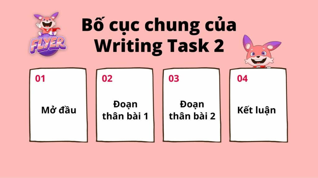 Nắm rõ bố cục chuẩn cho bài luận trong IELTS Writing Task 2 là một phần thiết yếu giúp bạn đạt được số điểm mong muốn. Hiểu được vấn đề quan trọng này, FLYER đã tổng hợp các bố cục bài viết cho từng dạng IELTS Writing Task 2 bên dưới.