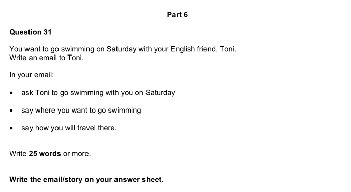 - Trong Part 6: thí sinh viết một đoạn tin nhắn ngắn (note hoặc email), đã có những nội dung gợi ý