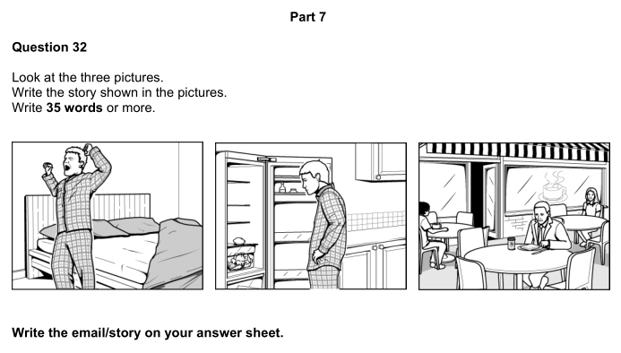- Trong Part 7: thí sinh viết đoạn văn dựa vào các bức tranh cho sẵn, KHÔNG có các câu gợi ý từ trước. Cần luyện tập bằng cách đọc các câu chuyện ngắn và chú ý các mở đầu câu chuyện, phát triển nội dung và kết thúc câu chuyện.