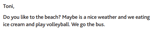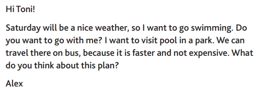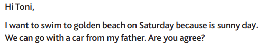 Thí sinh có cố gắng hoàn thành bài thi. Người viết không nói rõ nội dung rủ Toni đi bơi nhưng có thể hiểu được ý người viết trong đoạn văn. Bài viết có tính liên kết, nhưng chỉ sử dụng được từ because để liên kết câu. Sử dụng được ngữ pháp căn bản nhưng vẫn còn lỗi, dẫn đến hiểu sai ý (swim to golden beach, a car from my father)