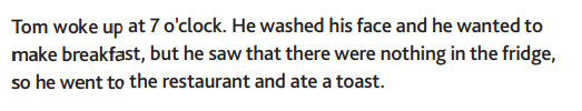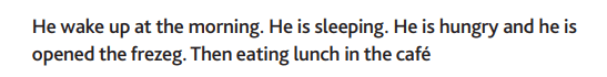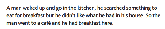 Thí sinh có cố gắng hoàn thành bài thi, nhưng thông tin được trình bày hạn chế có thể do thiếu từ nối hoặc từ nối sử dụng không hiệu quả. Thí sinh sử dụng được từ vựng căn bản, sử dụng đúng động từ nhưng dạng của động từ không chính xác (he is opened).