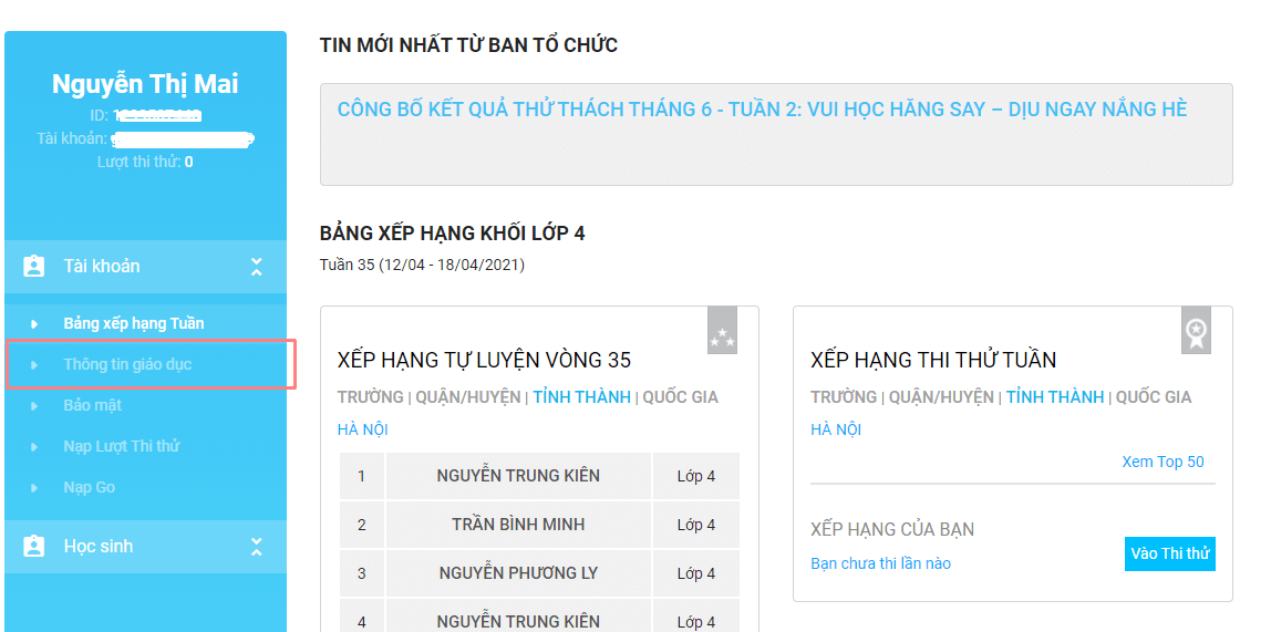 Thông tin đăng kí cần đảm bảo chính xác vì hệ thống sẽ sắp xếp bài thi tự luyện hợp với lứa tuổi của học sinh (ví dụ, lớp 3, lớp 4 hoặc lớp 5). Nếu điền thông tin không chính xác, các em cần sửa lại thông tin bằng cách click vào mục “Thông tin giáo dục” để sửa lại.