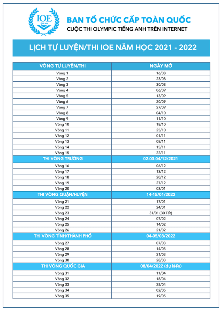 Để theo dõi lịch mở vòng tự luyện và lịch thi IOE các cấp năm học 2024 – 2025, vui lòng truy cập trang tin chính thức của IOE hoặc theo dõi Fanpage IOE: Olympic tiếng Anh trên Internet.