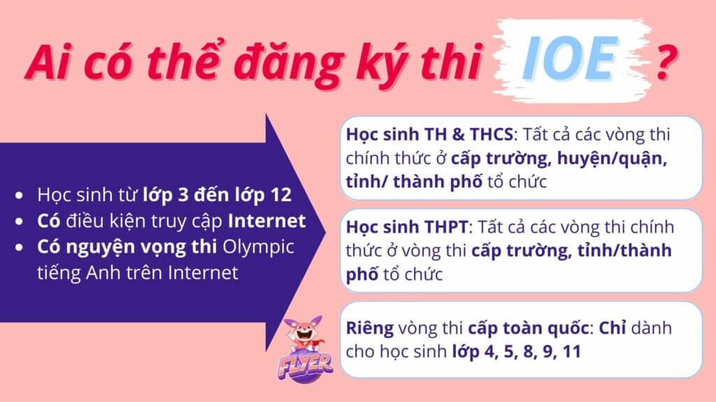 Cuộc thi tiếng Anh IOE của Bộ Giáo dục & Đào tạo không còn là khái niệm xa lạ với những học sinh và phụ huynh quan tâm đến môi trường học tập tiếng Anh trên Internet. Cuộc thi dành cho ai, tham gia như thế nào và phương pháp luyện tập ra sao? Chi tiết về cuộc thi tiếng Anh IOE gồm đối tượng, thể lệ và cách thức đăng ký sẽ được FLYER tổng hợp trong bài viết dưới đây. Mời phụ huynh cùng theo dõi.