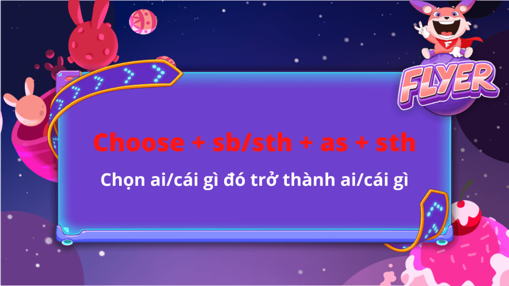 Cấu trúc “choose + as” có nghĩa là chọn ai/ cái gì đó trở thành ai/ cái gì. Cấu trúc này có ý nghĩa tương đương với cấu trúc:
