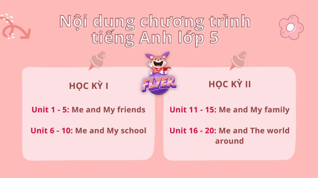 Chương trình tiếng Anh lớp 5 mới xoay quanh các chủ đề vô cùng gần gũi và quen thuộc với trẻ như: bạn bè, gia đình, trường học và thế giới xung quanh. Chương trình bao gồm 20 Units riêng biệt, trong đó, mỗi học kỳ tương ứng với 10 unit.