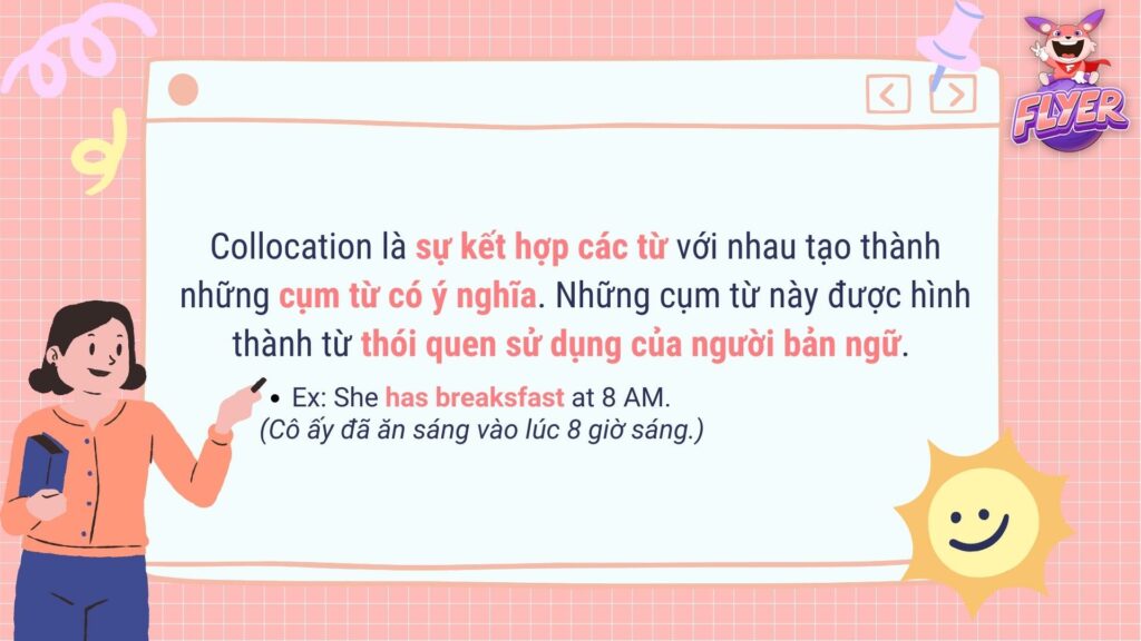 “Collocation” là sự kết hợp các từ với nhau tạo thành những cụm từ có ý nghĩa. Những cụm từ này được hình thành từ thói quen sử dụng từ ngữ của người bản ngữ.