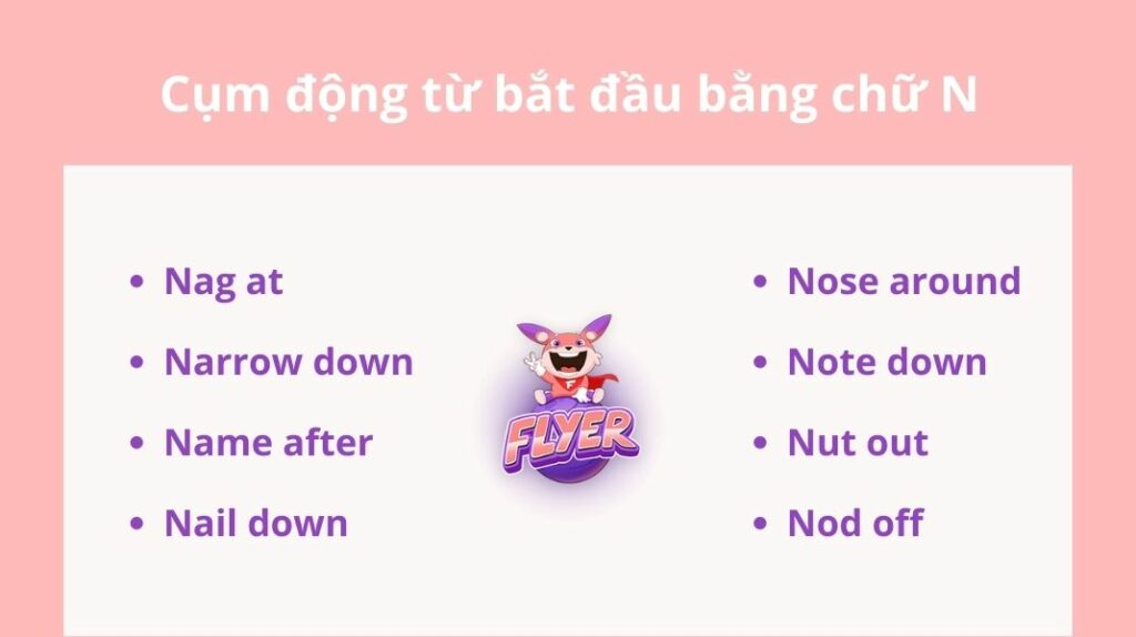 Trong bài viết này, FLYER sẽ giới thiệu đến bạn các cụm động từ thông dụng bắt đầu bằng chữ “N” được hình thành từ động từ chính: “nag, nail, name, narrow, nod, nose, note”.