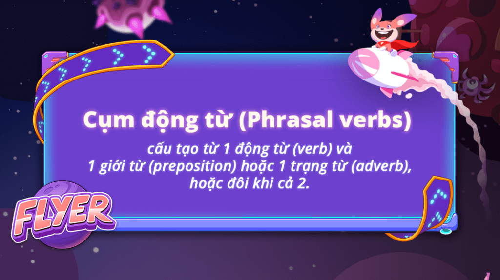 Trước tiên, FLYER sẽ giải thích ngắn gọn về cụm động từ (phrasal verbs). Cụm động từ được cấu tạo từ 1 động từ và 1-2 tiểu từ (giới từ và/hoặc trạng từ).
