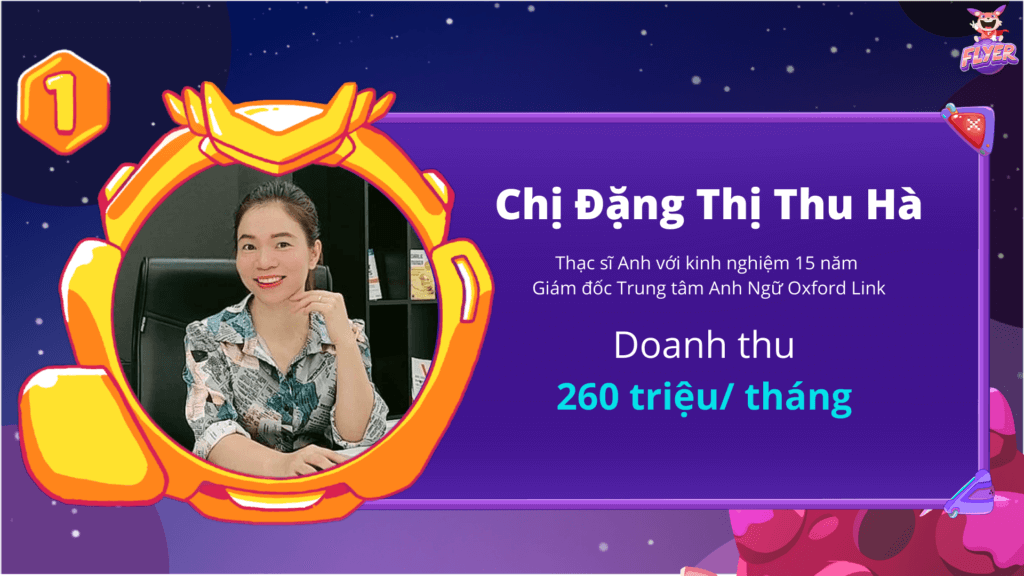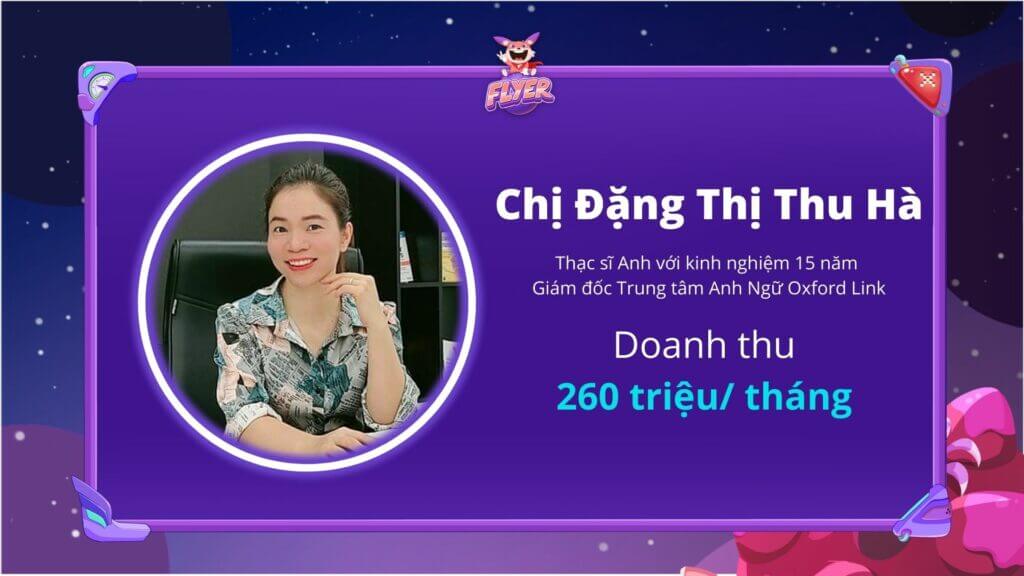 Chị Đặng Thị Thu Hà – giám đốc trung tâm Anh ngữ Oxford Link, sau 1 năm hợp tác, đã xuất sắc trở lại đại lý độc quyền Phòng thi ảo FLYER tại 2 tỉnh Nghệ An và Hà Tĩnh, với doanh số trung bình trên 260 triệu/tháng. Đặc biệt trong 3 tháng vừa qua, chị Hà luôn là đại lý đứng trong top đầu về doanh số khi liên tục nhận được các giải thưởng: