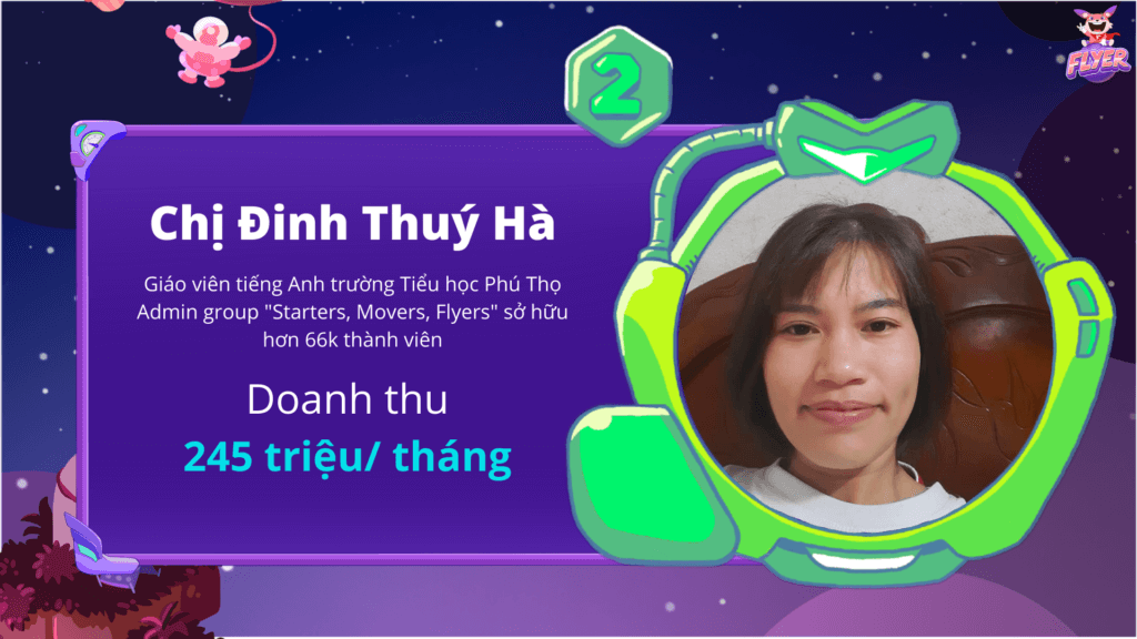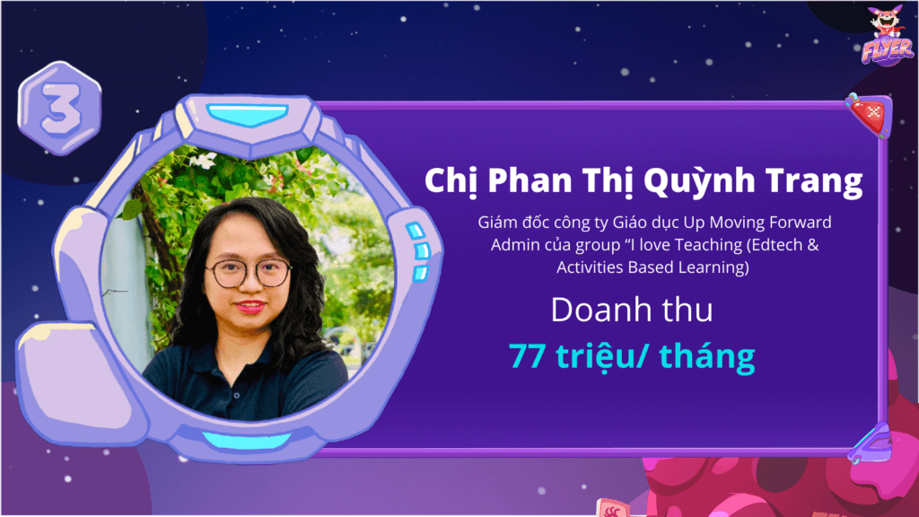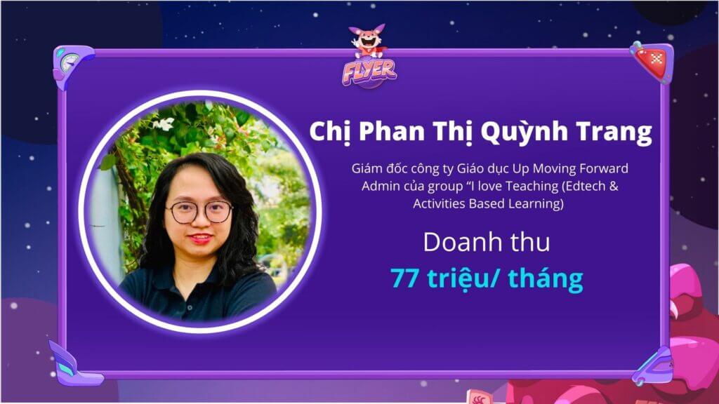 Chị Phan Thị Quỳnh Trang, hiện đang là giám đốc công ty Giáo dục Up Moving Forward và admin của group “I love Teaching (Edtech & Activities Based Learning), cũng là một trong 5 đại lý tiêu biểu của FLYER. Được chị Quỳnh Trang đánh giá là một trong những sản phẩm công nghệ giáo dục hay và bổ ích nhất học sinh, đến nay FLYER đã đồng hành cùng chị Quỳnh Trang hơn 1 năm và giúp đem lại doanh thu trung bình lên tới 77 triệu/ tháng.