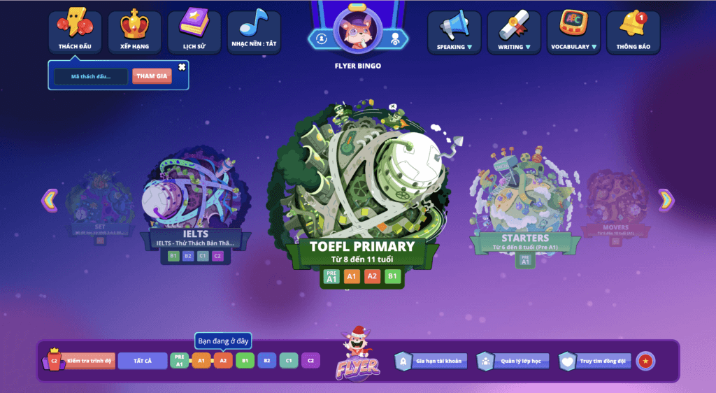 - Đa dạng cấp độ ôn luyện, gồm: Starters, Movers, Flyers, KET, PET, TOEFL Primary, TOEFL Junior, IOE (Olympics tiếng Anh), đề ôn thi tiếng Anh học kỳ lớp 3-4-5, bộ đề luyện thi tiếng Anh vào lớp 6 trường chuyên/chất lượng cao,…