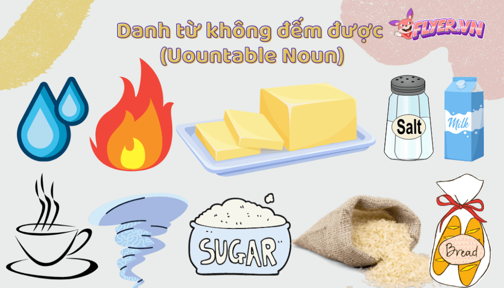 Danh từ không đếm được là những danh từ chỉ sự vật, đồ vật, hiện tượng, khái niệm,… không thể đong đếm bằng số lượng. Khác với danh từ đếm được, danh từ không đếm được không có dạng thức số ít hay số nhiều vì không dùng số đếm.