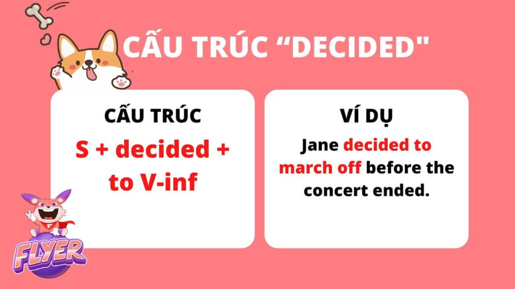 | Decided + to V-inf | Diễn tả ai đó đã quyết định thực hiện một hành động nào đó. | He’s decided to wait for Jane until 9 pm. Anh ấy đã quyết định đợi Jane đến 9 giờ tối. |