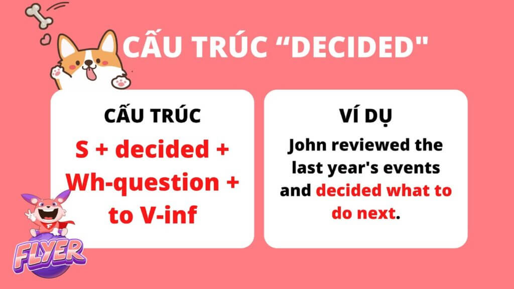 Cấu trúc “decided” này cũng là một cấu trúc phổ biến trong tiếng Anh, được dùng để diễn tả một quyết định nào đó đã được đưa ra liên quan đến những yếu tố cụ thể như “như thế nào?/ cái gì?/ ai?”. Các yếu tố này tương ứng với mỗi cấu trúc “Wh-question” (how, what, who).