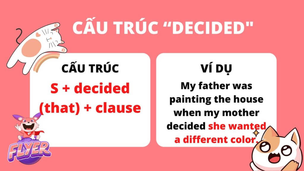 “Decided” cũng có thể được theo sau bởi một mệnh đề. Trong trường hợp này, “decided” dùng để diễn tả việc ai đó đã quyết định một sự việc nào đó diễn ra.