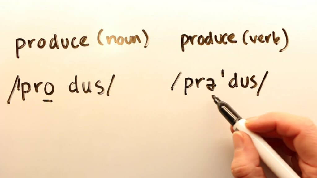 - Trong câu thứ hai, produce là động từ (làm ra, sản xuất). Chúng ta sẽ đặt trọng âm ở âm tiết thứ hai (pro’duce / PROduce).