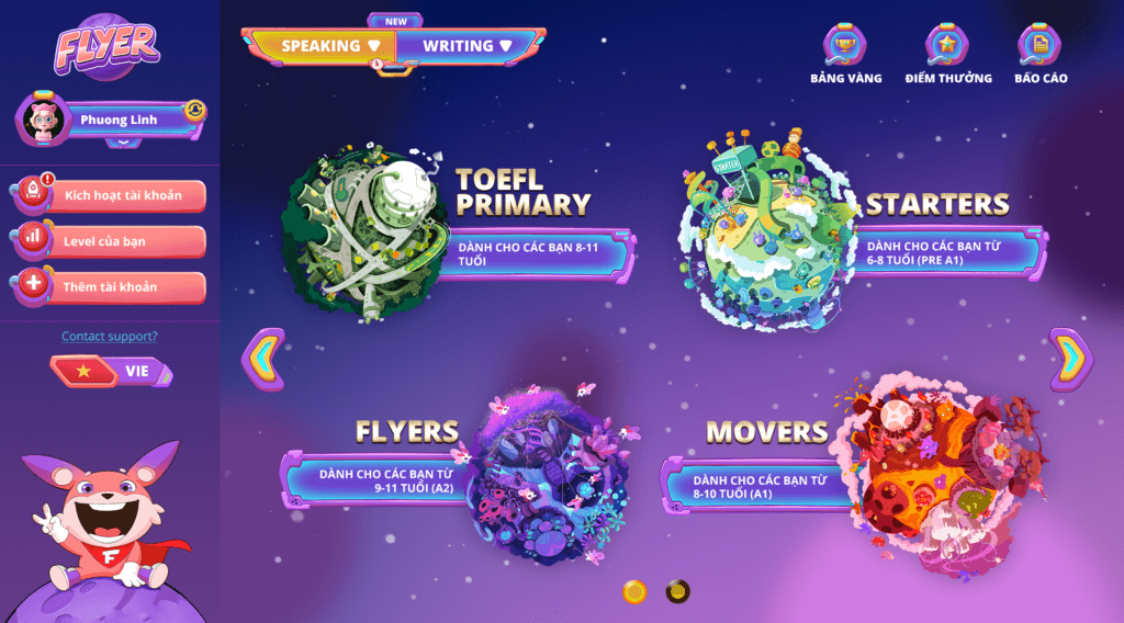Ngoài đồ họa bắt mắt, FLYER thu hút trẻ bởi con được thi đấu, nhận thưởng. Cũng giống như game, FLYER muốn tạo ra 1 sân chơi thi đua lành mạnh cho trẻ, tránh nhàm chán trong quá trình ôn luyện.