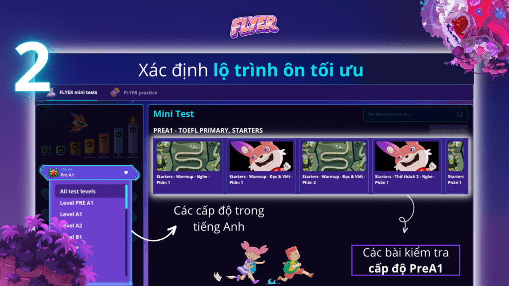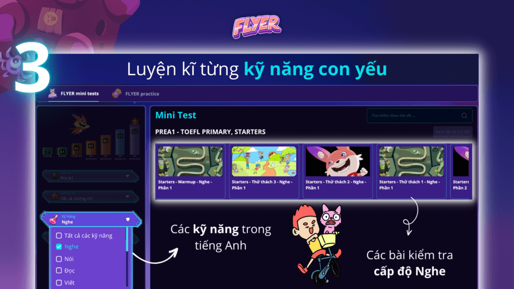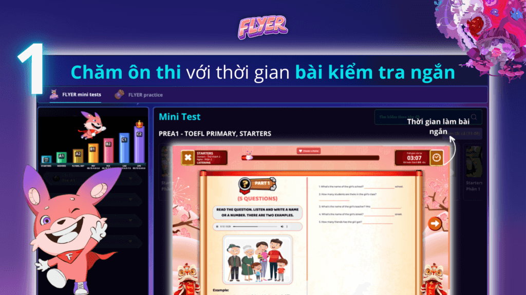 Với tính năng Practice – Luyện tập nhanh này, FLYER hi vọng có thể đem đến cho học sinh một phương pháp ôn luyện hiệu quả nhất. Đồng thời, hình thành được thói quen học tiếng Anh ở trẻ & xây dựng niềm yêu thích môn học này, giúp trẻ giỏi tiếng Anh một cách tự nhiên nhất.