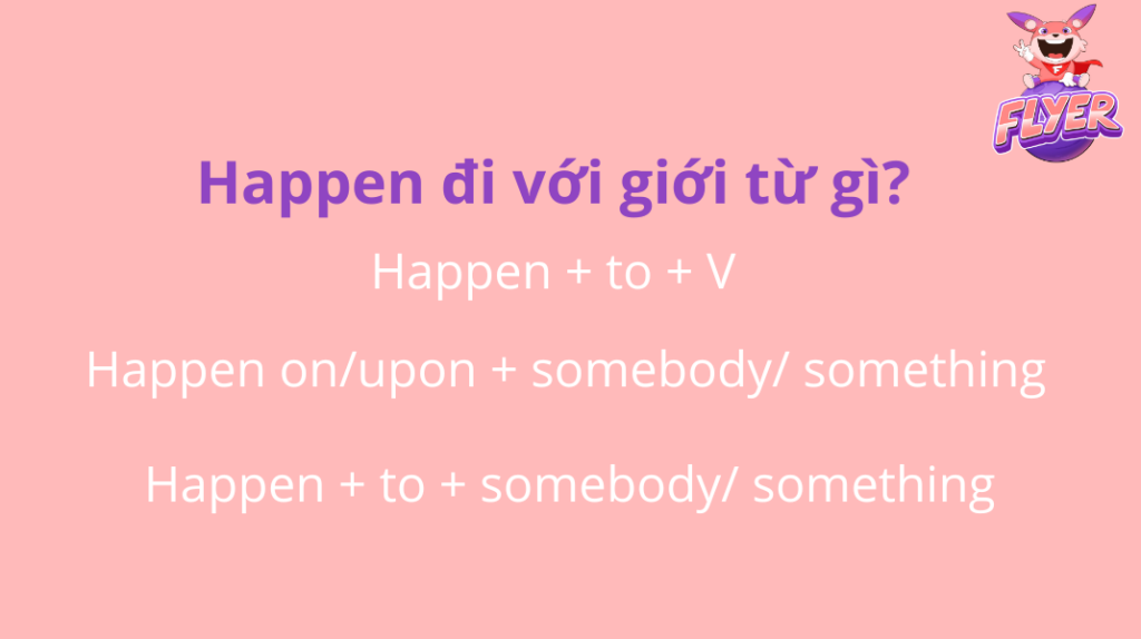 Đến đây, chắc hẳn bạn cũng đã biết “Happen” có nghĩa là gì rồi. Vậy thì bạn đã sẵn sàng để đi tìm câu trả lời cho câu hỏi “Happen đi với giới từ gì” rồi đấy! Hãy cùng FLYER điểm qua một vài cấu trúc với động từ “Happen” bạn nhé!