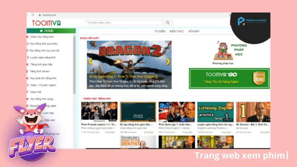 Toomva là website học tiếng Anh online qua những video phụ đề song ngữ Anh – Việt với hàng trăm chủ đề khác nhau. Khi xem phim trên web, bạn có thể sử dụng các chức năng tương tác trong video như lặp lại câu, lưu câu, tra từ điển trực tiếp trên video, lưu từ điển của tôi, chỉnh tốc độ nói chậm,… Điều này sẽ giúp việc học và luyện nghe tiếng Anh của bạn trở nên hiệu quả hơn rất nhiều.
