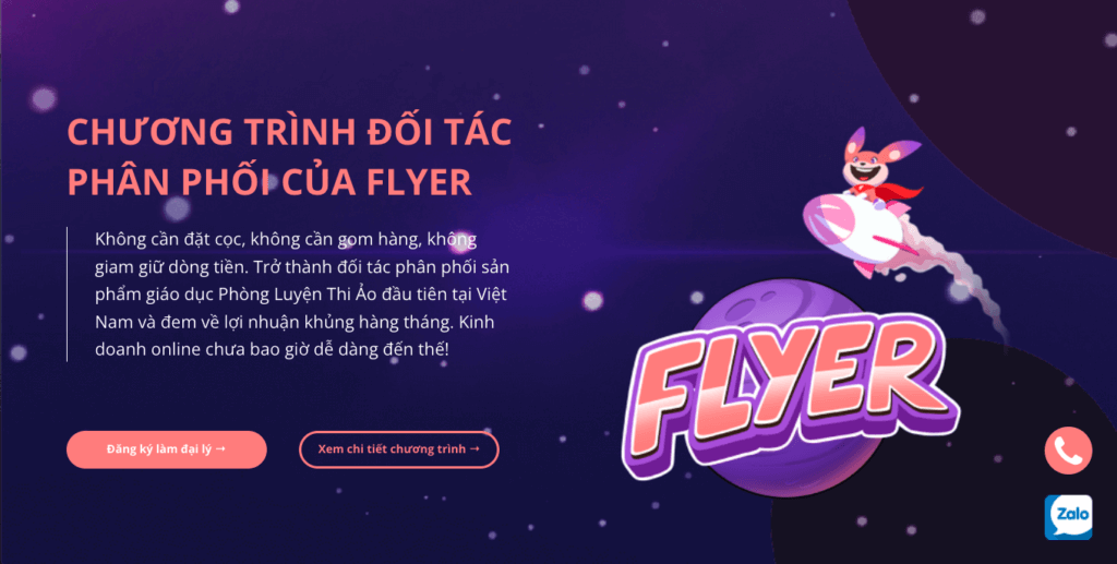 Với mong muốn mở rộng và mang sản phẩm Phòng Luyện Thi Ảo Cambridge & TOEFL đến với mọi trẻ em trên khắp cả nước, FLYER đang tìm kiếm thêm các đối tác thân thiết, đội ngũ Đại lý trên toàn Việt Nam. Dù bạn đã có mạng lưới gồm hàng ngàn học sinh hay chỉ mới bắt đầu kinh doanh sản phẩm giáo dục, bạn đều có thể thành công với FLYER!